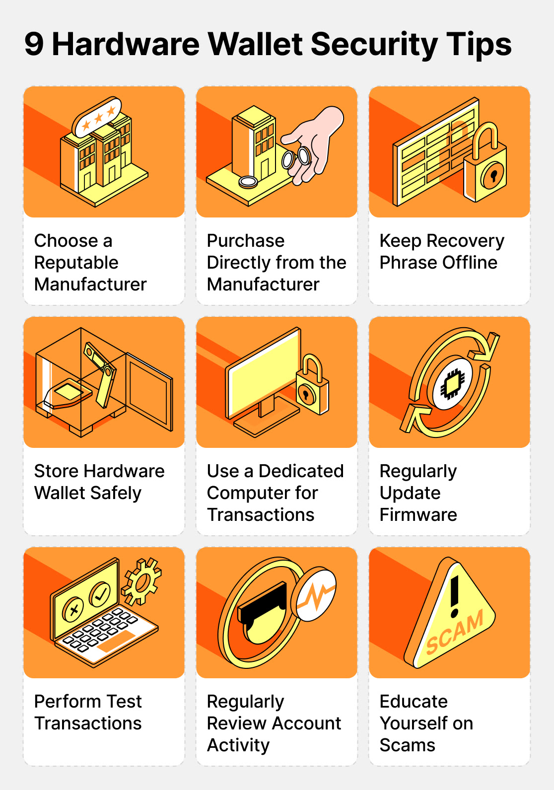 9. Uddan dig selv om svindel: Hold dig opdateret om almindelige svindelnumre og phishing-taktikker, der sigter mod brugere af hardware-wallets. Uddan dig selv om potentielle trusler og vær forsigtig med uopfordrede henvendelser eller anmodninger om følsomme oplysninger. En opmærksom og vidende bruger er bedre rustet til at beskytte deres aktiver mod svigagtig aktivitet.