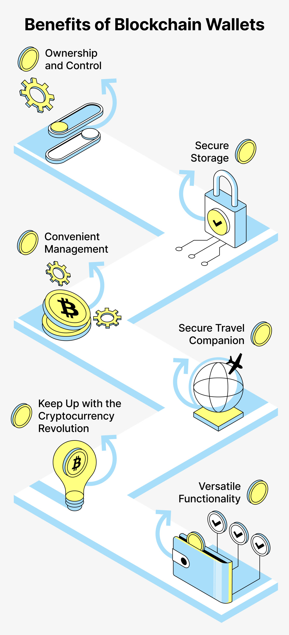 प्राथमिक लाभ एक ब्लॉकचेन वॉलेट का यह है, कि यह व्यक्तियों और संस्थानों को क्रिप्टो वस्तुओं को रखने और वेब 3.0 अर्थव्यवस्था में भाग लेने की सुविधा प्रदान करता है। बिना एक ब्लॉकचेन वॉलेट के, क्रिप्टो वस्तुओं को सीधे मालिकाना करना और नियंत्रण करना कठिन होता है। पारंपरिक बैंकिंग प्रणालियों के विपरीत, जहां तीसरे पक्ष आपके निधि प्रबंधित करते हैं, एक ब्लॉकचेन वॉलेट आपको अपनी डिजिटल वस्तुओं पर पूर्ण स्वामित्व और नियंत्रण के साथ सशक्त बनाता है।