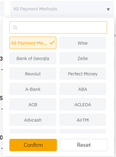 - Vyberte kryptomenu, ktorú chcete kúpiť (napríklad USDT), a vyberte menu, ktoré chcete použiť (napríklad USD). Okrem toho môžete určiť svoje preferované platobné metódy.