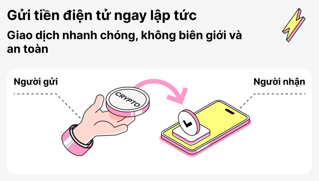 Ví dụ, bạn có thể chuyển Bitcoin, Ethereum hoặc các stablecoin cho người thân, và họ sẽ ngay lập tức nhận được tiền vào ví của họ, dù ở bất cứ đâu. Sau đó, bạn bè, đồng nghiệp hoặc người thân của bạn có thể đổi số tiền mã hóa đó sang tiền pháp định địa phương hoặc dùng nó để thanh toán trực tuyến.